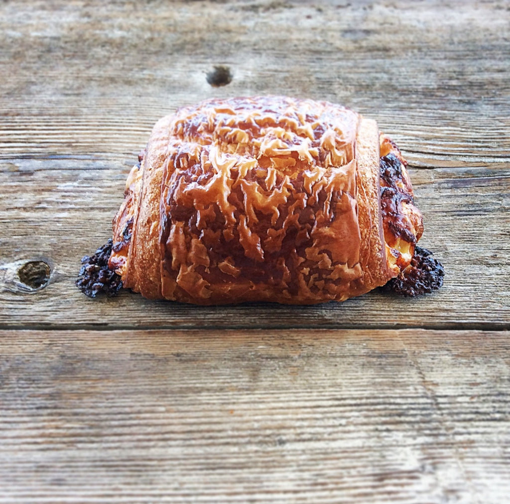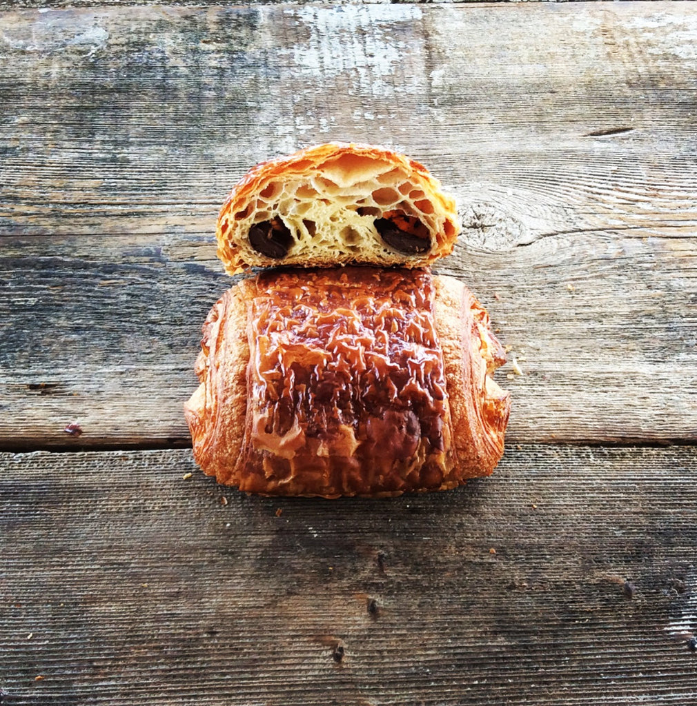 Pain au Chocolate: A Pain au chocolat, is a viennoiserie sweet roll consisting of a cube-shaped piece of laminated dough, with two pieces of dark chocolate in the center.