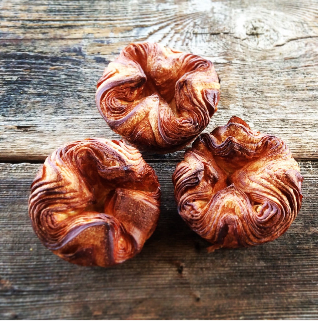 Kouign Amann, a specialty of Brittany, Kouign Amann is our croissant dough, sprinkled with sugar and a bit of sea salt (during lamination). Cut into squares and folded into a muffin tray, when baking, the butter melts the sugar, and the result is crunchy caramelization and a buttery center. (sold in singles)